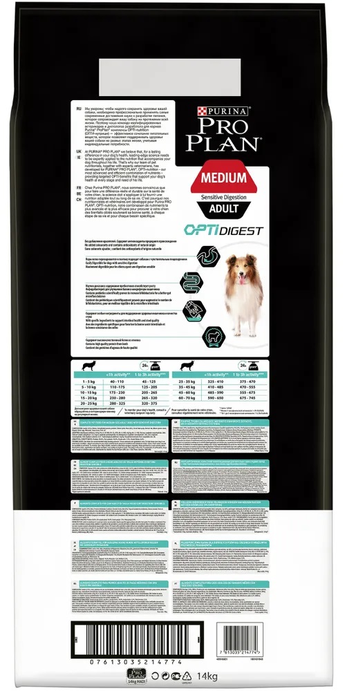 Правильное функционирование пищеварительной системы имеет важное значение для получения питательных веществ, необходимых вашей собаке. Разработанный нашими ветеринарами и диетологами корм Пурина Про План Эдалт Медиум Сенситив Дигестион с комплексом OPTIDIGEST® повышает здоровье пищеварительной системы собак, испытывающих дискомфорт в желудочно-кишечном тракте. Клинически доказано: OPTIDIGEST® содержит отобранный источник пребиотиков для улучшения баланса микрофлоры кишечника и качества стула.