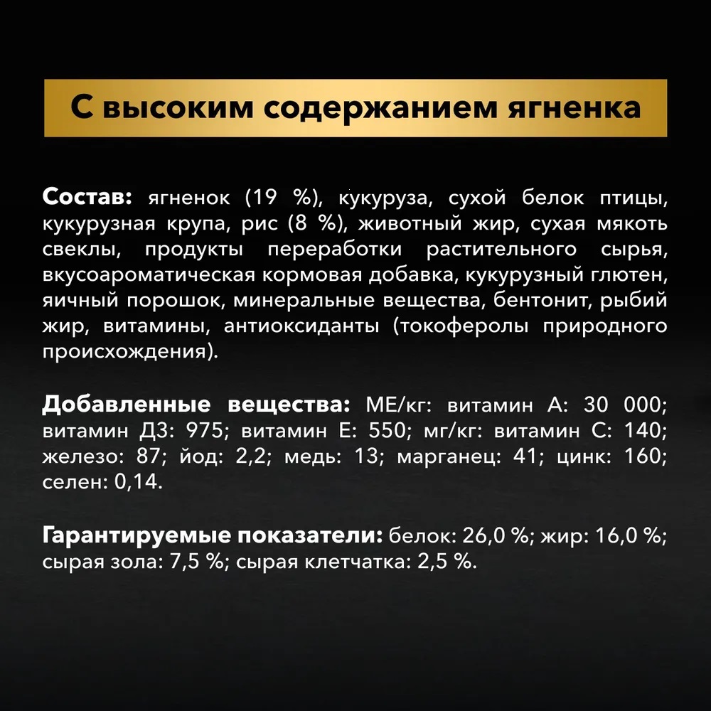 ягненок (19%), сухой белок птицы, кукуруза, кукурузная крупа, рис (8%), животный жир, сухая мякоть свеклы, продукты переработки растительного сырья, вкусоароматическая кормовая добавка, кукурузный глютен, яичный порошок, минеральные вещества, бентонит, рыбий жир, витамины, антиоксиданты (токоферолы природного происхождения).